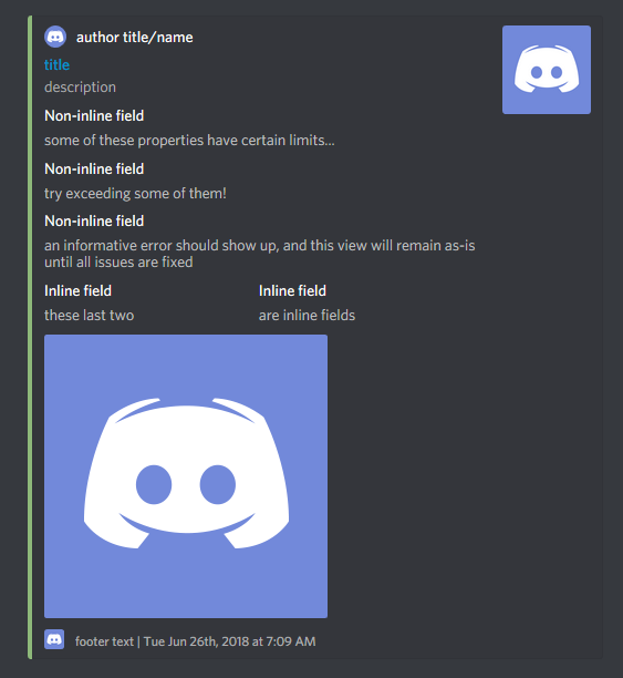 To add embed fields, use the command embed.fields. All placeholders are valid in fields as well.